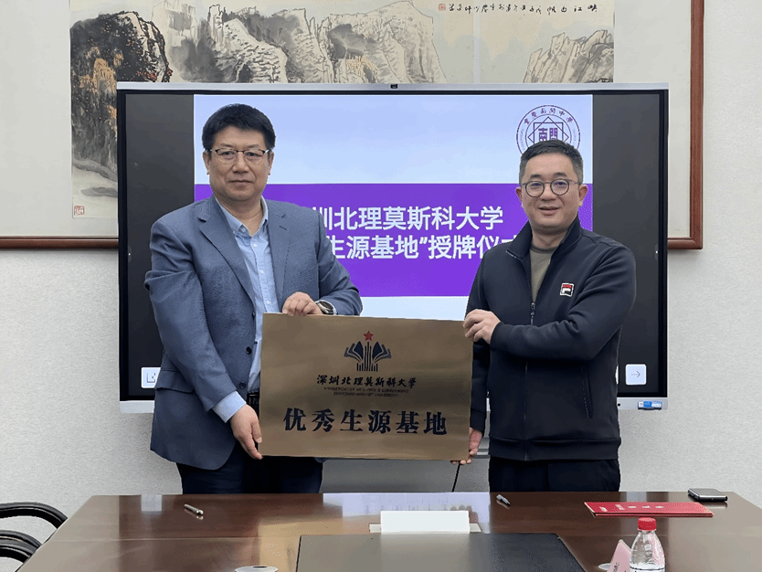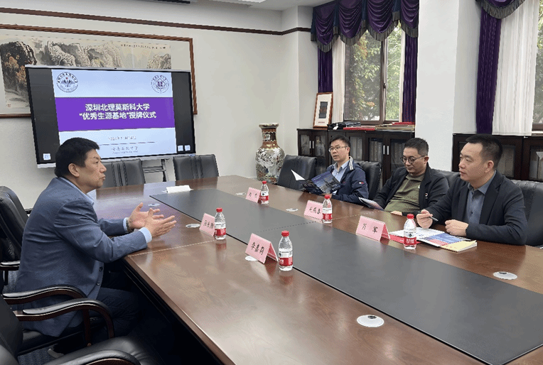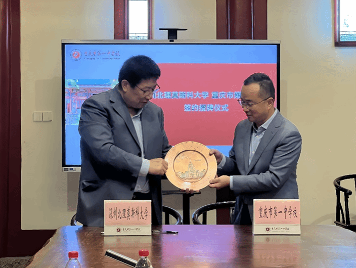 緊接著,招生組前往重慶一中,與重慶一中黨委副書記廖治華、副校長何文吉、教務(wù)處副主任王紅旗進(jìn)行了積極的交流互動。雙方就教育資源共享、學(xué)生培養(yǎng)路徑等話題交換了意見,重慶一中表達(dá)了希望教師能夠前往深北莫參觀學(xué)習(xí)的愿望,同時期待組織學(xué)生開展研學(xué)活動,張東翔教授也積極回應(yīng),表示愿意協(xié)助邀請專家到校舉辦講座,助力學(xué)生拓寬視野、提升能力。張東翔教授與廖治華副書記順利簽訂生源基地協(xié)議,并向重慶一中授予優(yōu)秀生源基地牌匾及銅盤,進(jìn)一步深化了兩校之間的合作關(guān)系。