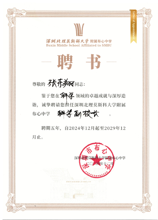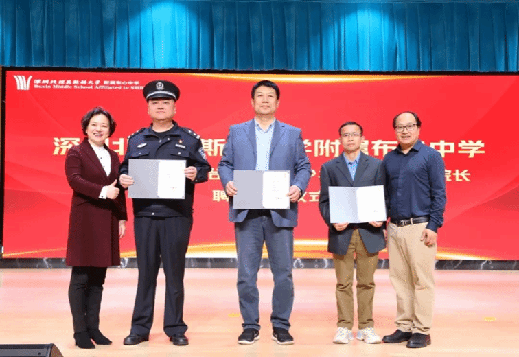 聘任儀式上,深圳北理莫斯科大學附屬布心中學正式聘請多位領域內的專家擔任重要職務。我校張東翔教授被聘任為科學副校長,深圳市公安局東湖派出所副所長洪鋼鋒受聘為法治副校長,深圳市市場監督管理局羅湖監管局東湖所副所長李志堅擔任食品安全監督副校長,中國作家協會會員徐頌翔先生受聘為少年文學院名譽院長。布心中學領導李永義書記和晏清校長共同為這些受聘專家頒發了聘書。張教授表示,他將利用自身的科研資源和教學經驗,積極推動中學與大學之間的合作,為學生提供更多接觸前沿科學的機會。