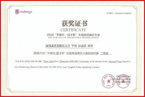 目前,本專業已有8名學生在科學研究、學科競賽、語言大賽等競賽中取得優異成績。包括2020年全國大學生數學建模競賽廣東省分賽一等獎、2020年美國大學生數學建模競賽(MCM/ICM)成功參賽獎、第30屆門捷列夫化學競賽二等獎和三等獎、2020“外研社·國才杯”全國英語演講大賽獎、第四屆來華留學生征文大賽特色獎。