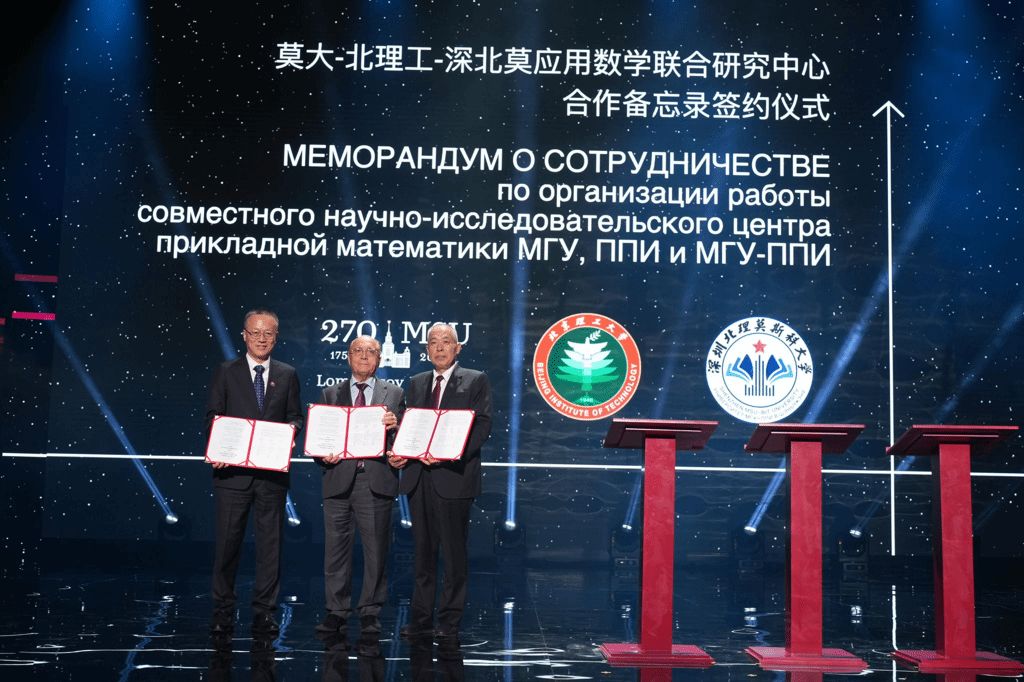 2022年11月30日,根據莫斯科大學、北京理工大學、深圳北理莫斯科大學的三校校長共同參與的深北莫辦學三方聯席會議第一次會議決議,鑒于三方在科教領域開展密切而卓有成效的合作,為進一步深化合作,三方在2023年10月24日簽署關于組建莫大-北理工-深北莫應用數學聯合研究中心的合作備忘錄,旨在統籌“應用數學聯合研究中心”(以下簡稱為“中心”)的組建與發展工作。