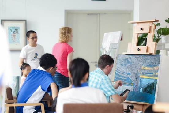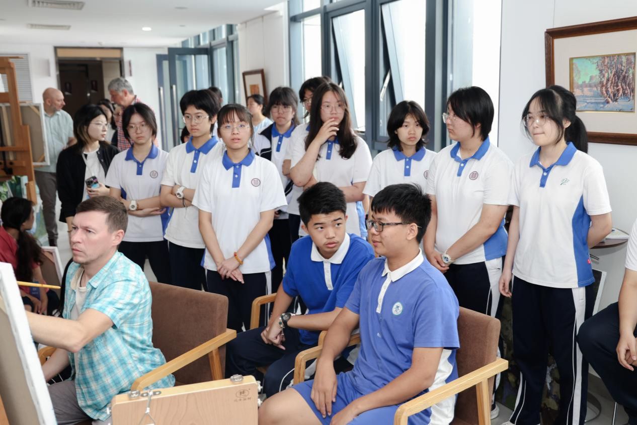 絢麗繽紛的畫布邊,擺放著斑駁的調(diào)色板,藝術(shù)家們提筆劃過畫布,落下星星點點的彩色印記,觀眾們或站或坐在后方,安靜地觀察和思考每一筆、每一劃背后的意蘊。發(fā)現(xiàn)身后的中學(xué)生對自己的畫刀很感興趣,列賓美院副教授丹切夫·謝爾蓋笑著拿起畫刀,示范起畫刀的用法。“老師們大膽的用色和外國油畫對景物的細致描繪,都跟我常畫的水粉畫很不同,和中國的風(fēng)格也很不同。”深圳市美術(shù)學(xué)校的學(xué)生張優(yōu)優(yōu)站在藝術(shù)家身后,在觀看油畫的構(gòu)思、構(gòu)圖、用色過程中,思考油畫與水粉畫、外國藝術(shù)家風(fēng)格與中國藝術(shù)家風(fēng)格的差異。