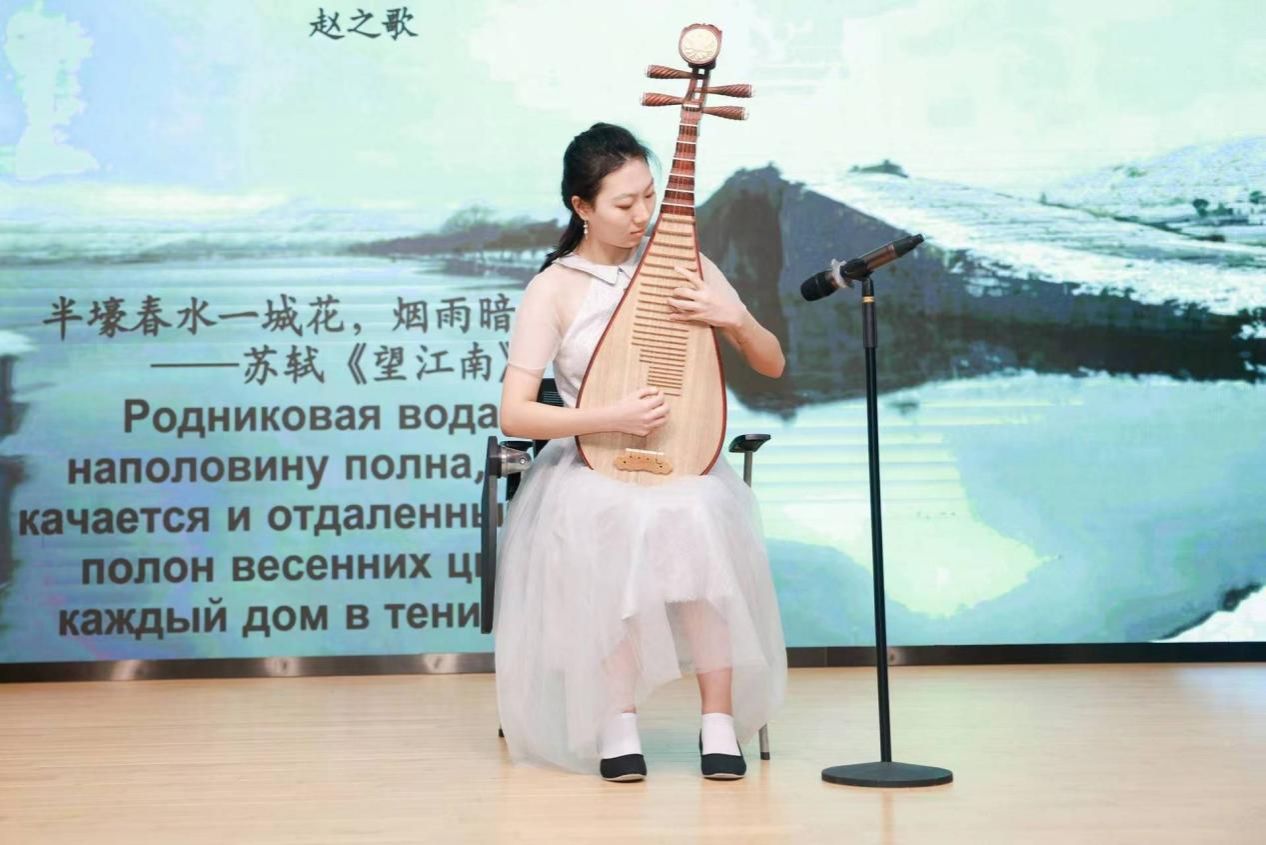 藝術(shù)中心教師維多利亞·伊瓦什金娜向觀眾深情朗誦普希金作品《葉甫蓋尼·奧涅金》中達吉雅娜寫給奧涅金的信。表演者身著一襲白衣、舉著一盞蠟燭走上舞臺,內(nèi)心激涌的愛意讓她時而坐在椅子上激情書寫,時而在舞臺上來回走動,臉上寫滿了幸福的表情,將少女的羞澀、熱情和對愛情的悸動展現(xiàn)得淋漓盡致。跟隨著工程系一年級學(xué)生趙之歌的琵琶演奏《憶江南》,觀眾們仿佛來到煙雨江南,表演者靈活地撥動著琵琶琴弦,清脆動聽的琴音又帶著幾許愁苦的味道。